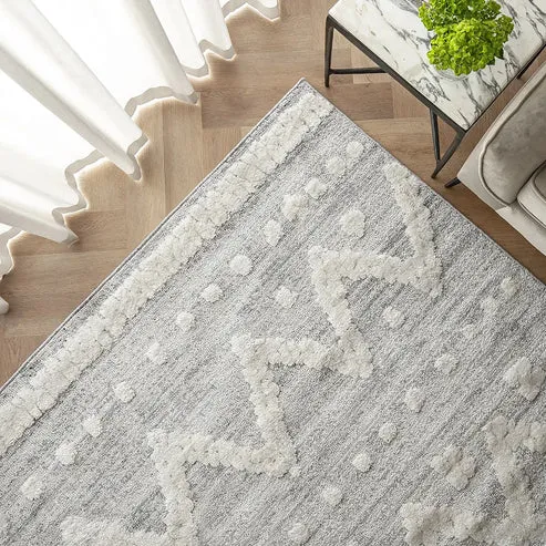 Enhance your interiors with the raised diamond and dot-patterned grey carpet. Its blend of grey and taupe shades adds calm sophistication to any décor. The raised diamond and dotted pattern rests on a subtle striped base, giving texture and depth to the design. Crafted from polypropylene with a matte finish, it offers durability with a soft, balanced feel underfoot. The 18 mm mixed pile provides extra comfort and a rich layered look. With its gently distressed, love-worn character, this carpet brings both modern and antique charm. Perfect for living rooms, bedrooms, guest rooms, and offices, it suits every elegant and relaxed space. Simple to maintain with spot cleaning or professional care when required.