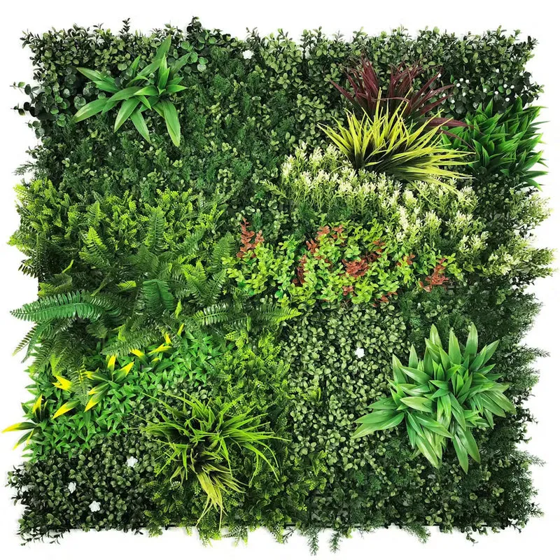 Lush Meadow Wall Grass panel with layered greenery, burgundy accents, and delicate flowers. UV-stable, maintenance-free artificial foliage for vibrant indoor and outdoor wall décor.