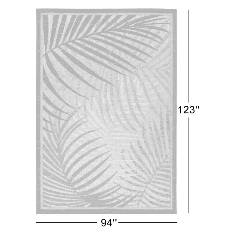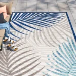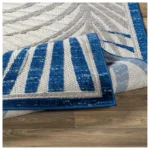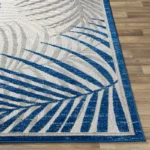 Cephas Floral Dark Blue/Aqua/Cream outdoor area rug features a bold botanical pattern with rich blue, aqua, and cream tones that brighten patios and indoor spaces. Made from durable synthetic fibers, it is stain-resistant, weather-resistant, and ideal for high-traffic indoor or outdoor areas.