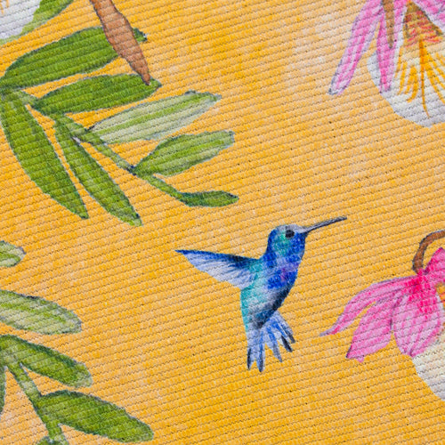 The Leopard Outdoor Rug – Yellow brings a tropical statement to any space. Digitally printed hand-painted leopard and jungle florals on a polyester flatweave. Lightweight, durable, and machine washable for indoor or outdoor use.