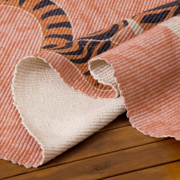 Bring exotic style to any space with this tribal-inspired Tibetan Tiger rug. A vibrant coral background with detailed tiger motifs adds charm to patios, balconies, or indoor areas. Lightweight, durable, weatherproof, and machine washable for easy care.