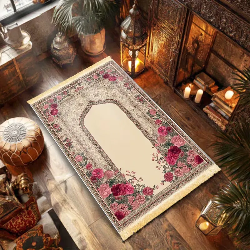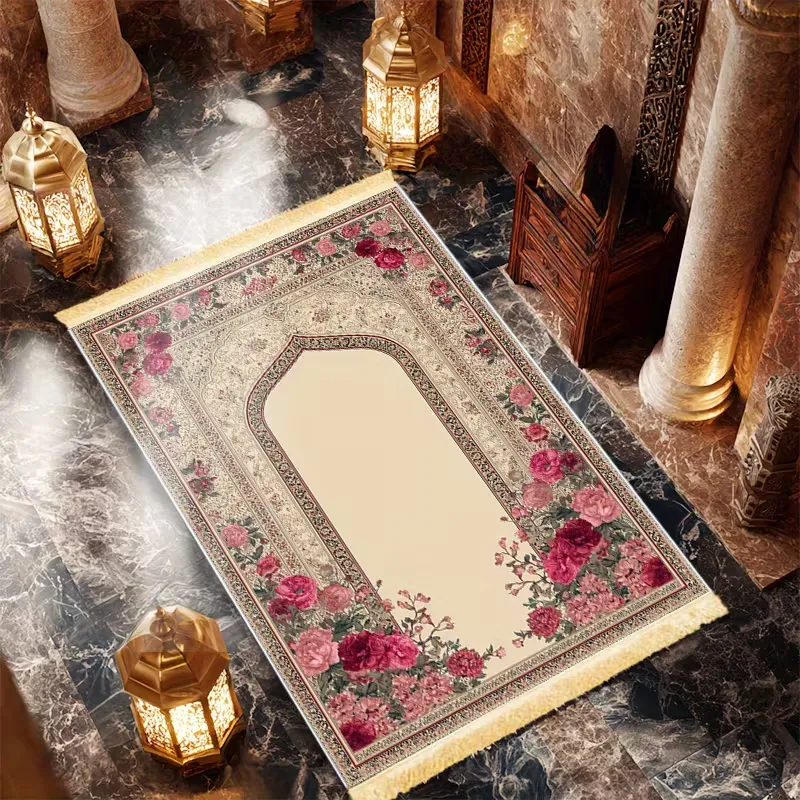 Islamic prayer mat with thick cushioned polyester surface, non-slip backing, and tassels. Foldable, machine washable, and durable, available in multiple colors, ideal for home use in bedrooms, living rooms, doorways, or personal prayer spaces.