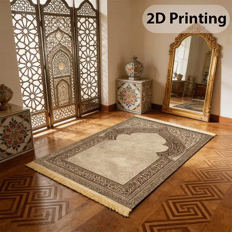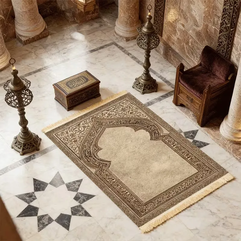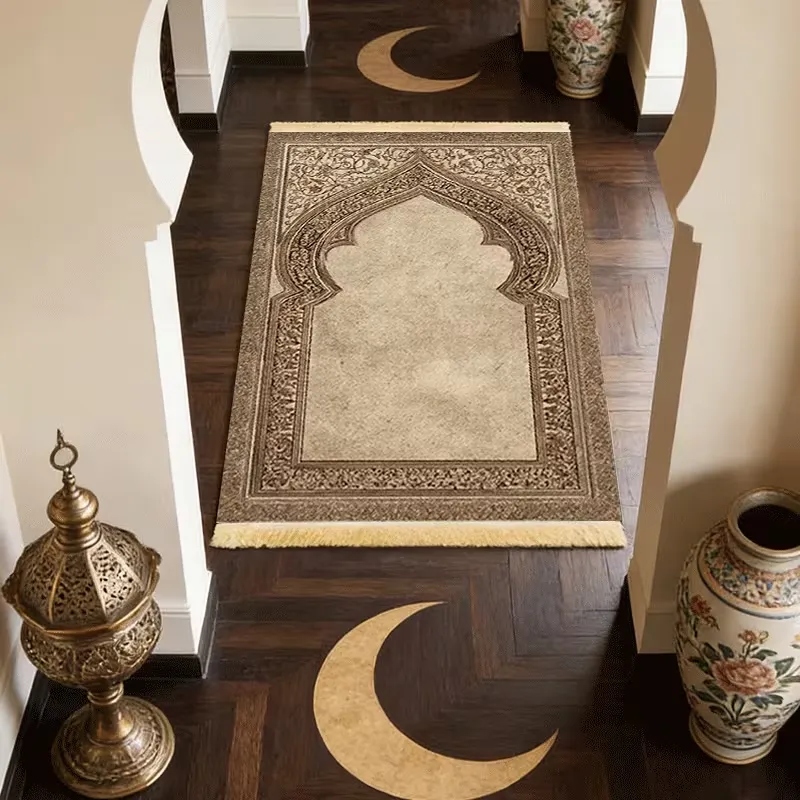 Thick Islamic prayer mat with soft polyester surface, non-slip backing, and decorative tassels. Foldable, machine washable, and durable, ideal for home use in doorways, living rooms, or personal prayer spaces.