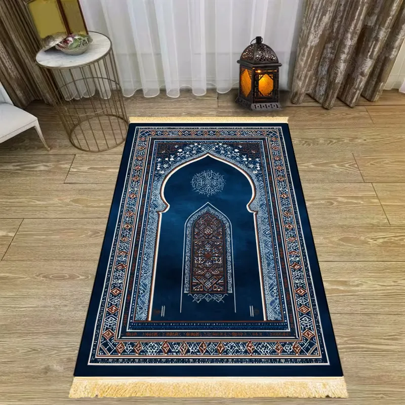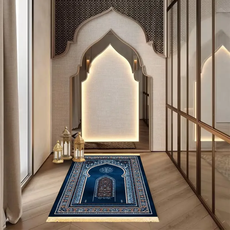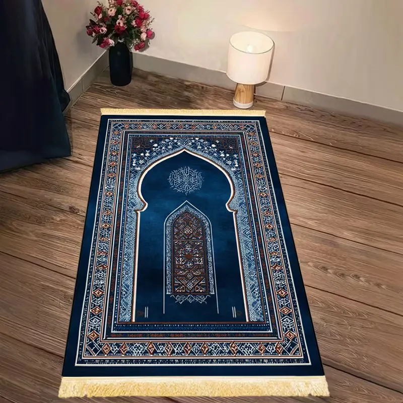 Luxury thick Islamic prayer mat with soft cushioning, non-slip base, and tassels. Foldable and machine washable, ideal for home, travel, or pilgrimage. Suitable for indoor use in doorways, living rooms, and personal prayer spaces.