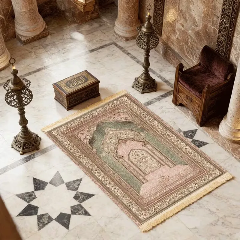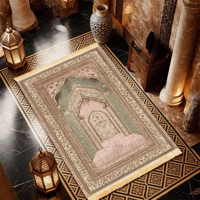 Luxury thick prayer mat with soft flannel surface and sponge base. Foldable, machine washable, and durable with tassels, ideal for home indoor prayer corners or prayer rooms for comfortable worship.