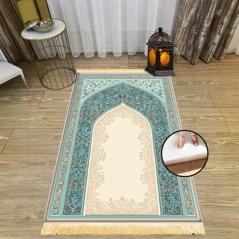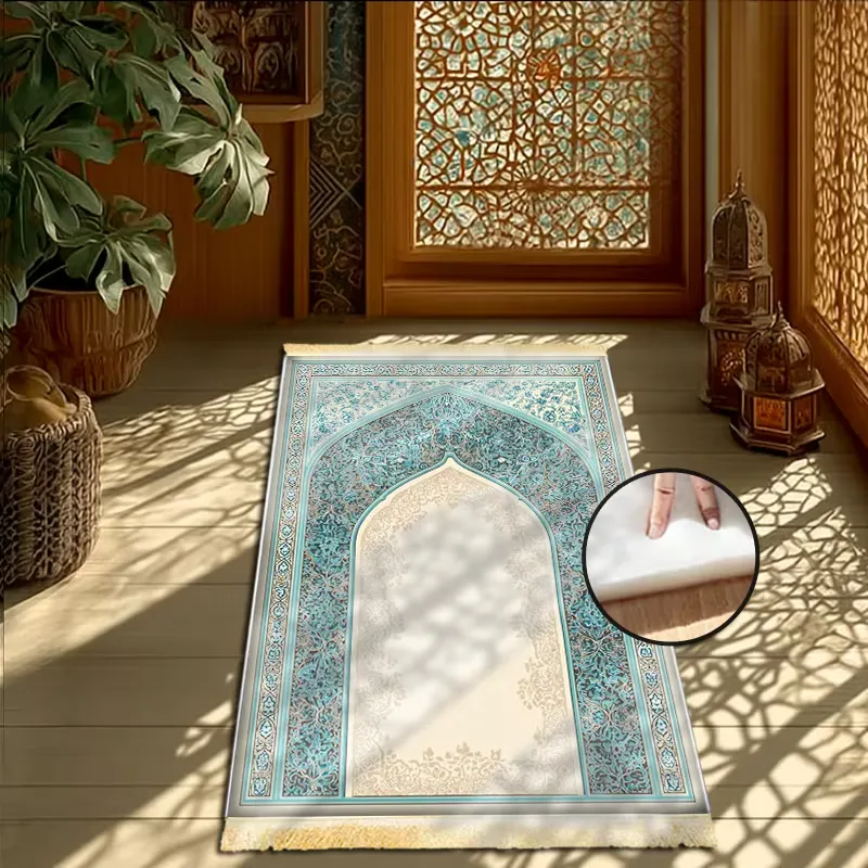 Luxurious thick prayer rug with soft cushioning and tassels. Foldable, non-slip, and machine washable, ideal for indoor home use in doorways, living rooms, or personal prayer spaces for Islamic worship.