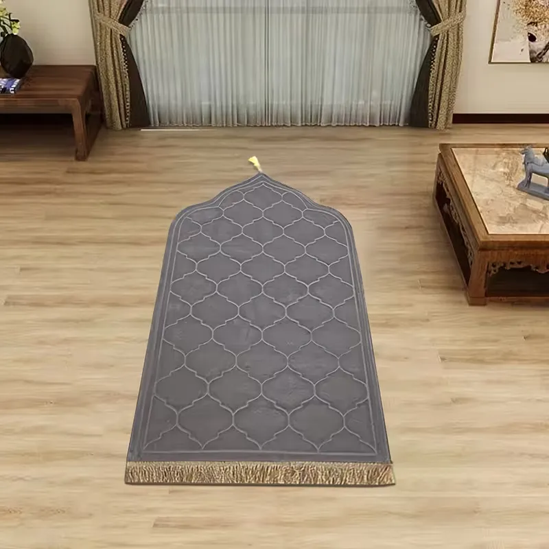 Thick fleece prayer mat with soft sponge padding ensures comfort during worship. Portable, non-slip design with decorative tassels makes it suitable for mosques, homes, and various prayer settings, offering durability and ease of use.