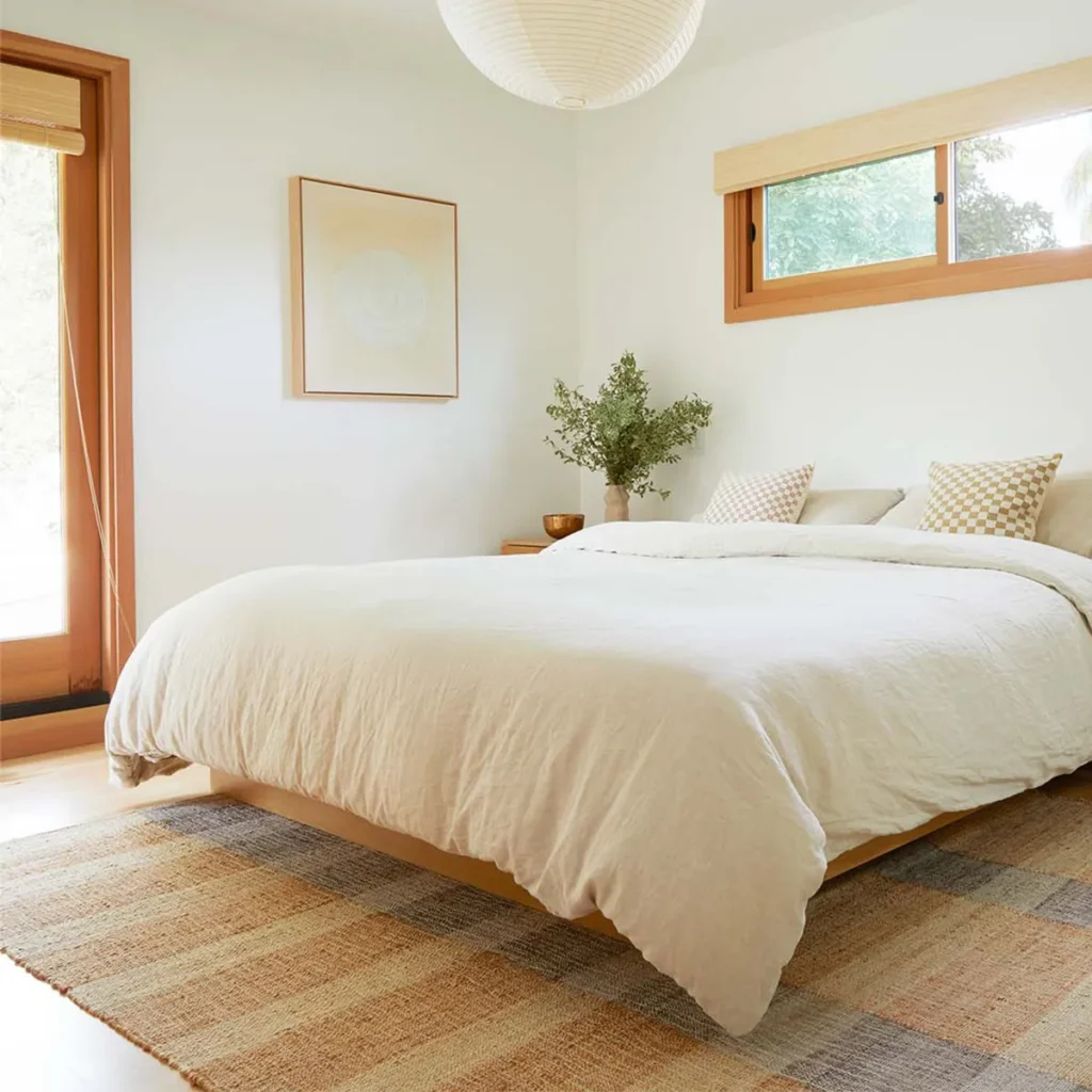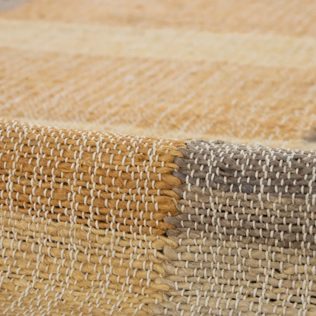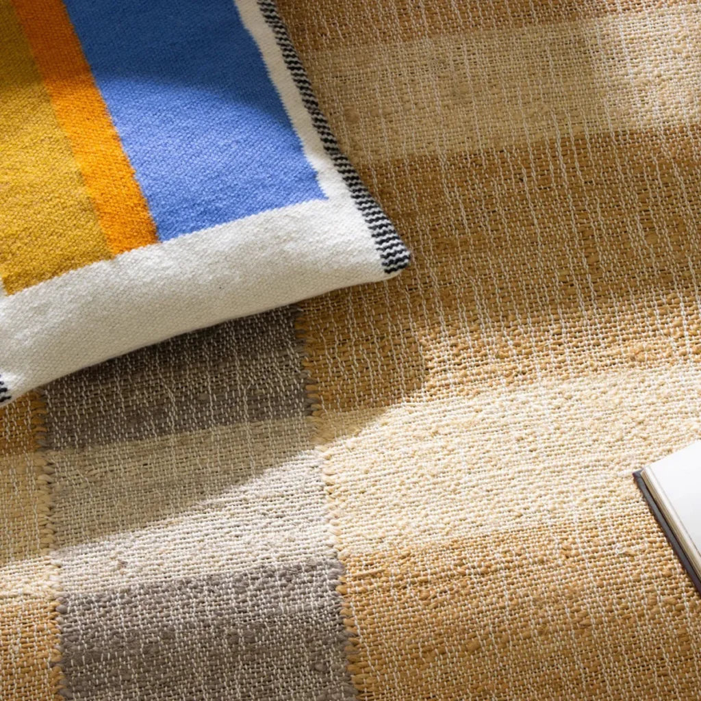 Hesse Jute Rug from Sisal Carpets features a handwoven flatweave design with natural jute and cotton fibers. Its elongated plaid pattern and neutral tones create a calm, minimalist look, making it a lightweight and versatile rug ideal for relaxed indoor spaces.